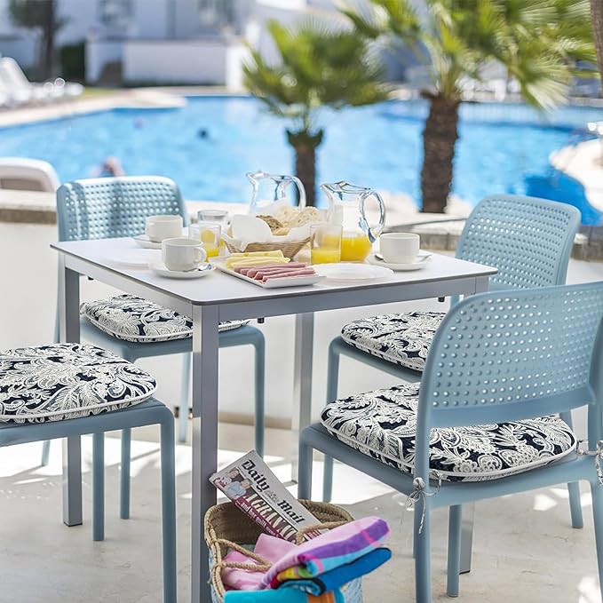 Indoor/Outdoor Chair Cushions 16x17 Inch, Patio Chair Cushions with Ties, All Weather Seat Cushions for Patio Furniture Home Garden Chair Use, Set of 4,Damask Lapis