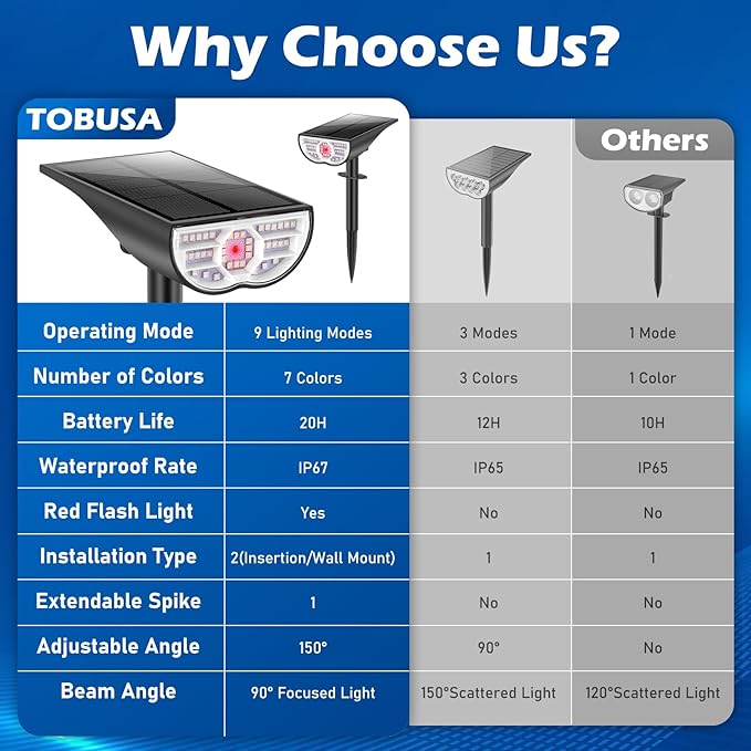 - 【2025 Upgraded Red Indicator Light】 Driven by customer-oriented values, TOBUSA kindly set aside an indicator light at the middle for each led solar landscape spotlights. The light keeps flashing in red when the color changing solar spot lights are under charging and auto off after charging completed. This smart design provides necessary convenience for our customer to track on the status of the solar battery