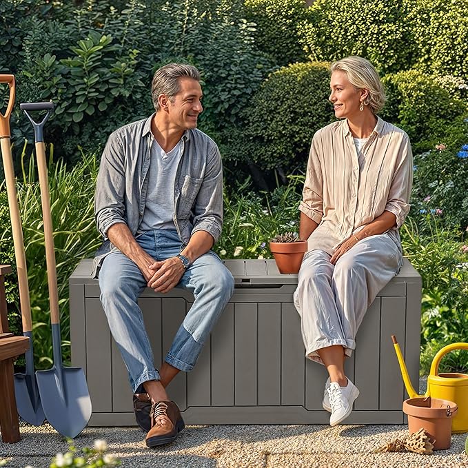 - Extra Seating: Doubling as a comfortable bench seat, this plastic deck box can support up to 485 pounds; Set it up in just 15-30 minutes, and enjoy its unique wood-grain texture that seamlessly blends with any patio or deck decor in no time