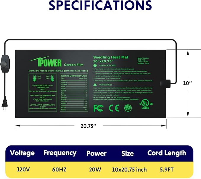 - Specifications: size: 10 X 20.75 inch; voltage: 120V; frequency: 60Hz; power: 20W. Package Included: 1 pack seedling heat mat with temperature adjustable knob