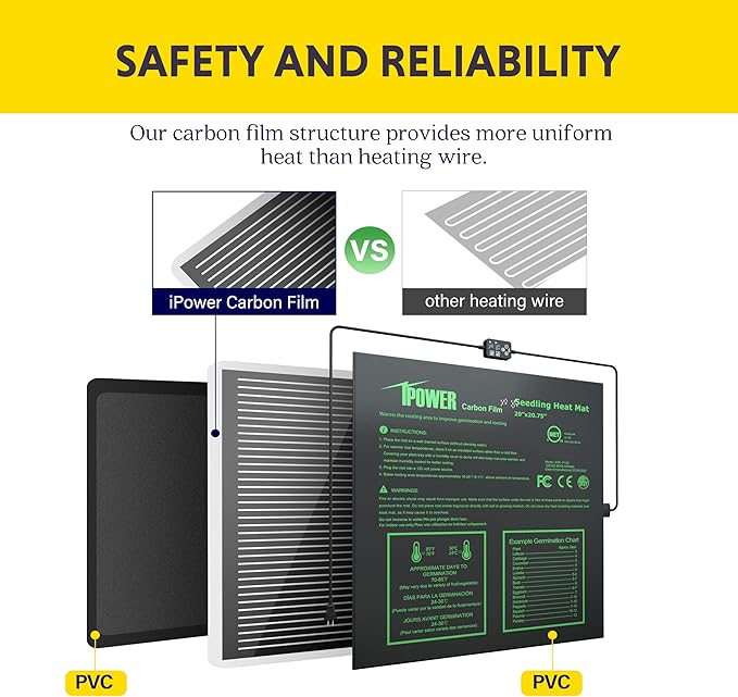 - Heating Film Structure: heating film ensure uniform heating. Warms root area 10-20℉(5-11℃) over the ambient air temperature, which will increase the success of seedlings and cuttings