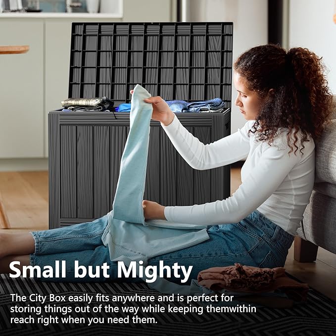 - ๐๐ฎ๐ซ๐๐๐ฅ๐ ๐๐๐ญ๐๐ซ๐ข๐๐ฅ - Made from high-quality resin material, this deck box provides unyielding protection for your belongings. With up to 1000 SGS UV protection, your outdoor storage box will never warp, fade, or crack. It withstands harsh weather, intense sunlight, and cold climates. Whether it's the sun-drenched summer or the stormy winter, your items will be safely stored, remaining in pristine condition.
