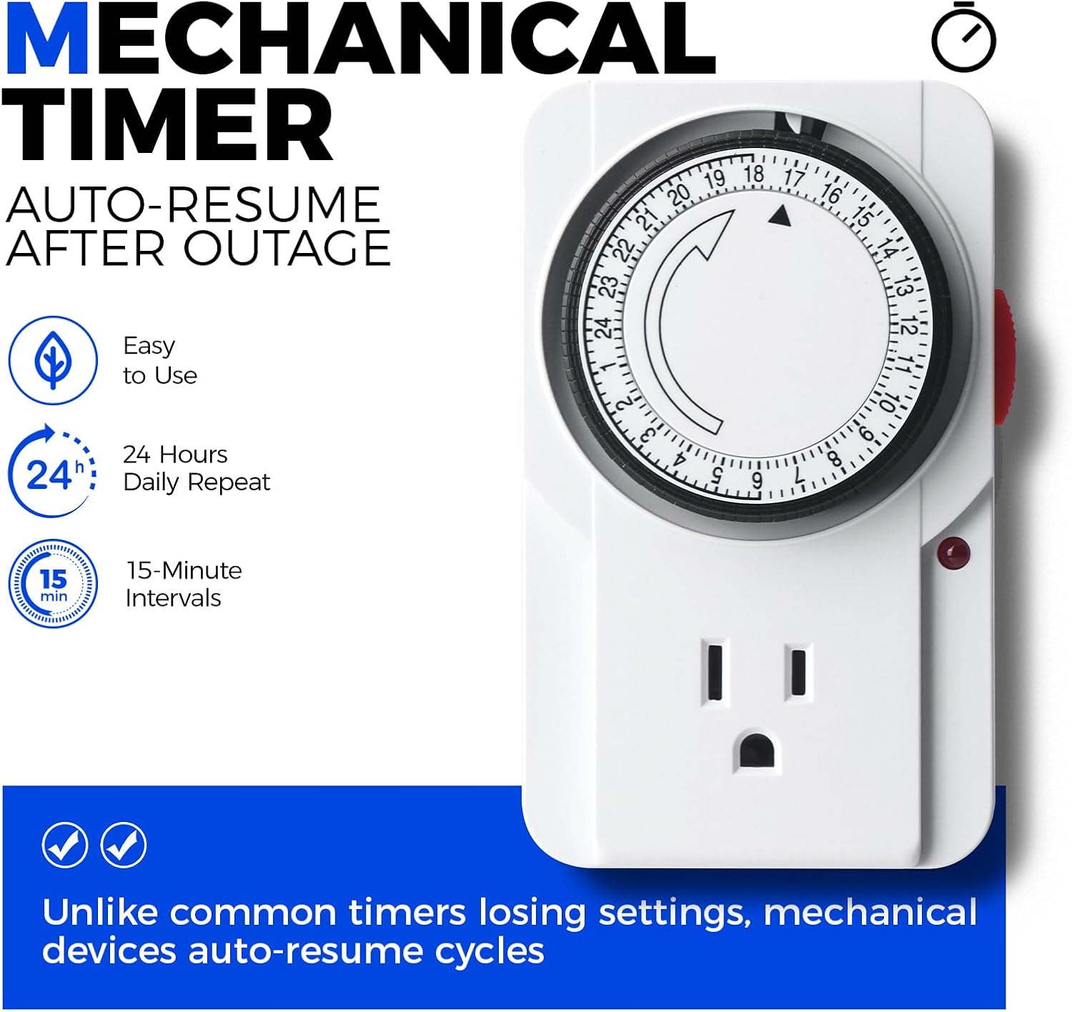 - Precision Timer Control for Effortless Operation: Our LED grow light is equipped with a mechanical outlet timer for precise lighting when you're away. Set it once for a 24-hour cycle with on/off intervals as short as 15 minutes. After programming, your plants are automatically taken care of daily, without the need for manual adjustments