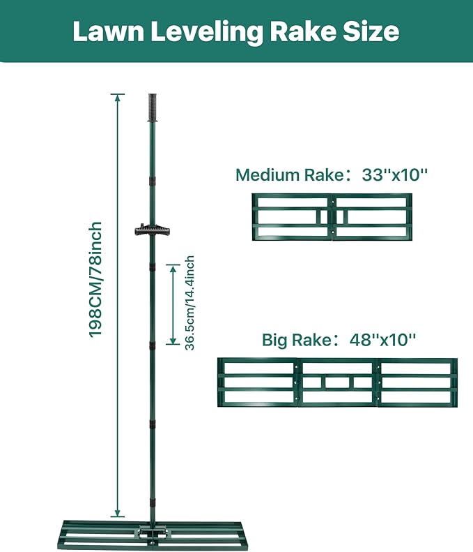 - Upgrade Structure & Multi-Function: 33x10'' lawn Leveling Rake is designed to tackle a variety of garden tasks, including distributing application materials, removing stones, breaking up small clods of sand or loam, mixing soil with fertilizers, and smoothing the soil for effortless planting. Mutil-function lawn rake makes planting and gardening much easier