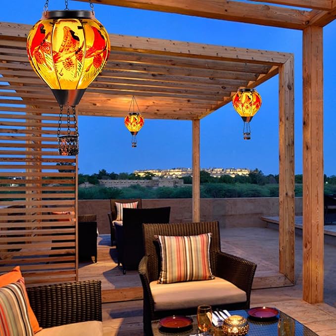 - 【Solar-Powered】Outdoor solar lanterns absorb sunlight during the day and automatically light up at night, providing 6-8 hours of lighting. The soft and warm light of hot air balloon solar lantern creates a romantic and peaceful atmosphere for the outdoor space.