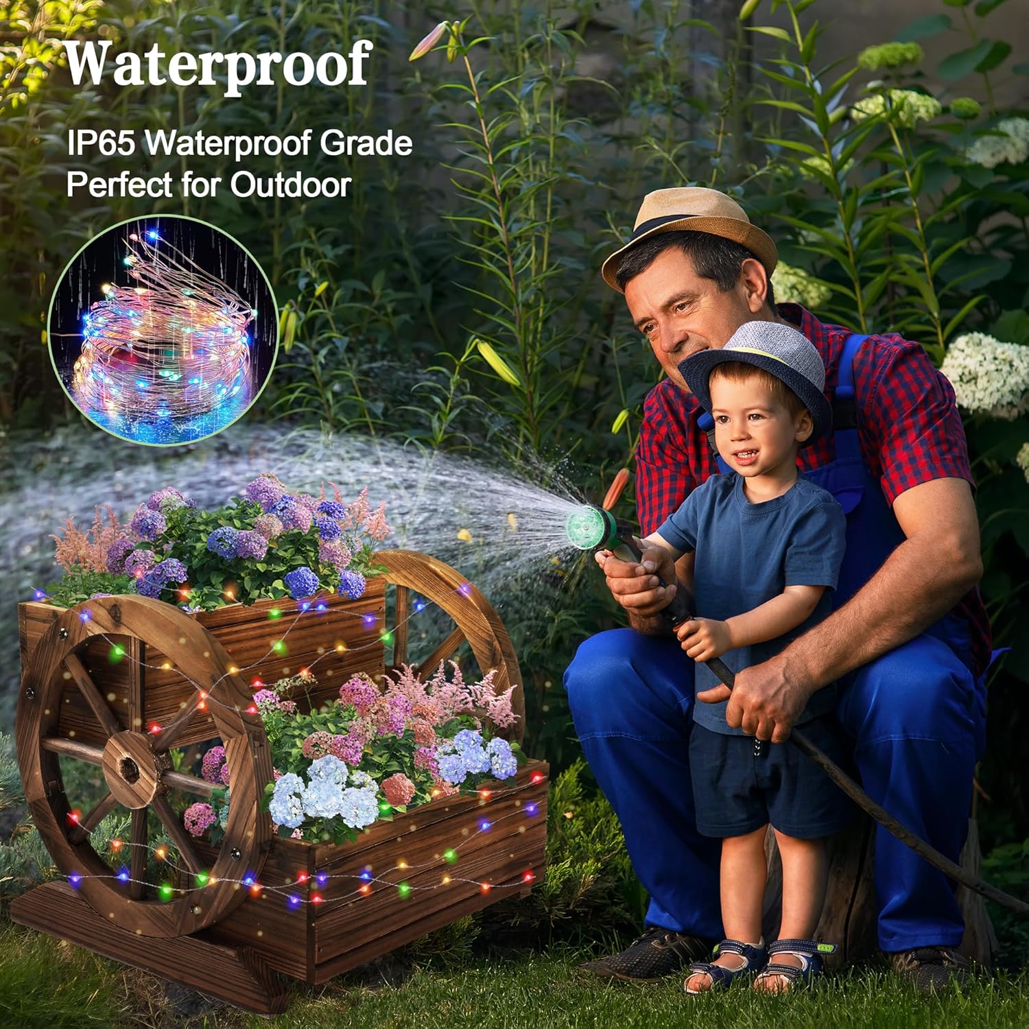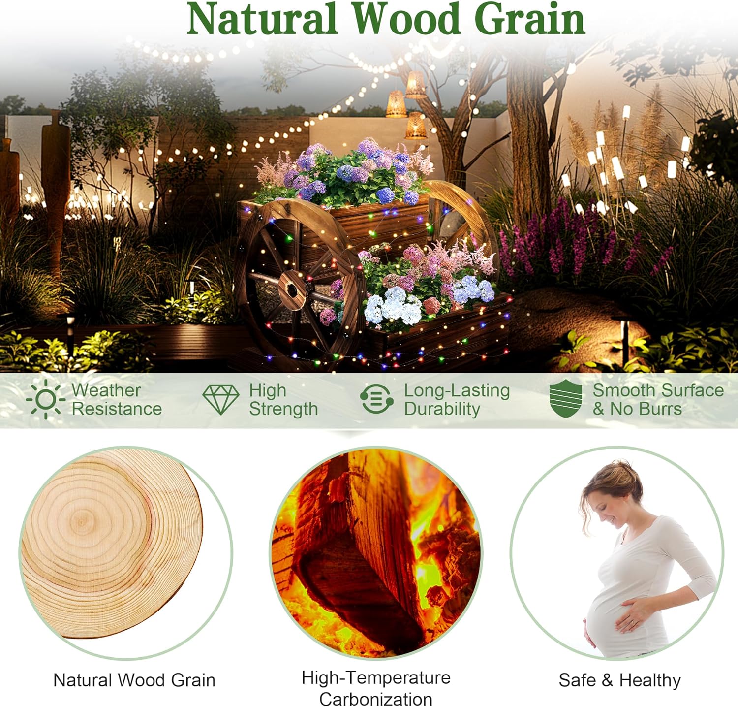 Wooden Wagon Planter Box with Solar Light, Garden Planter with Wheels,Decorative for Flowers Herbs Vegetables for Indoor & Outdoor Decor,Wooden Flower Cart for Patio Garden Balcony