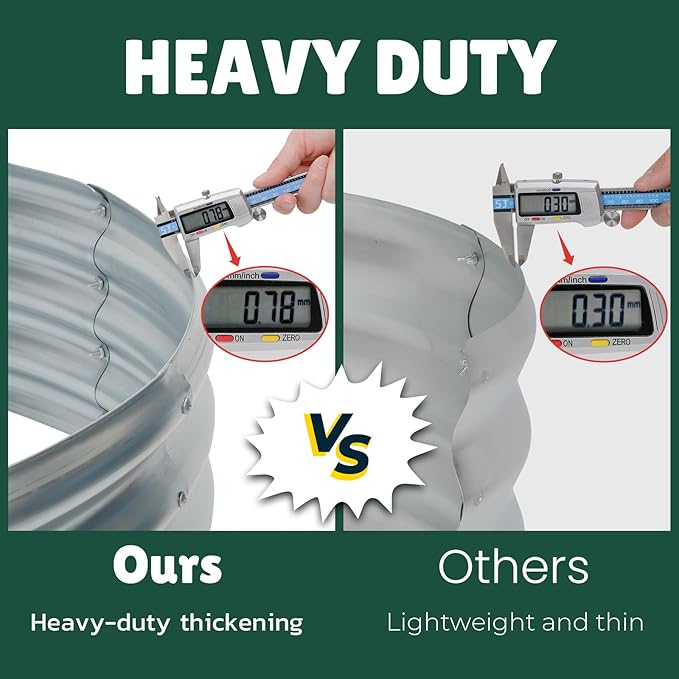- Double Thickness: This galvanized raised garden bed will be with you for many years of gardening; This outdoor garden planter box is made of 0.78mm thick galvanized corrugated steel sheet, which is structurally sound; You can use this vegetable bed on sunny or rainy days without worrying about it warping or rusting