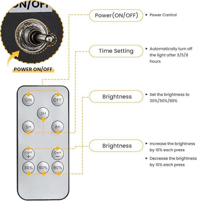 - Smart Remote Control | 10% Brightness Adjust & 3 Timers Customize security or ambiance with 3 timer modes (3H/5H/8H) and precise 10% brightness increments—no clunky 30% jumps like other brands. Pre-assembled design = 1-minute setup.