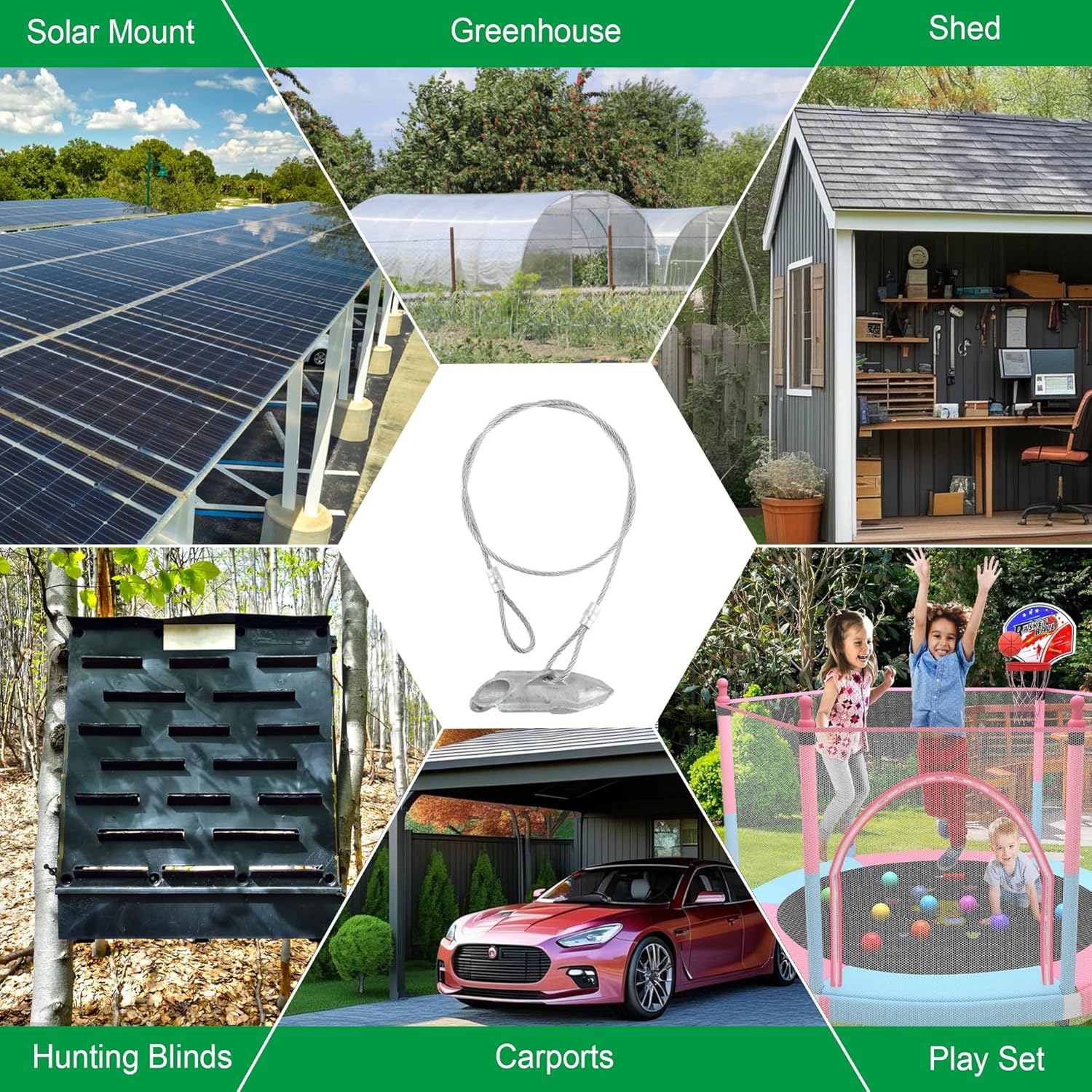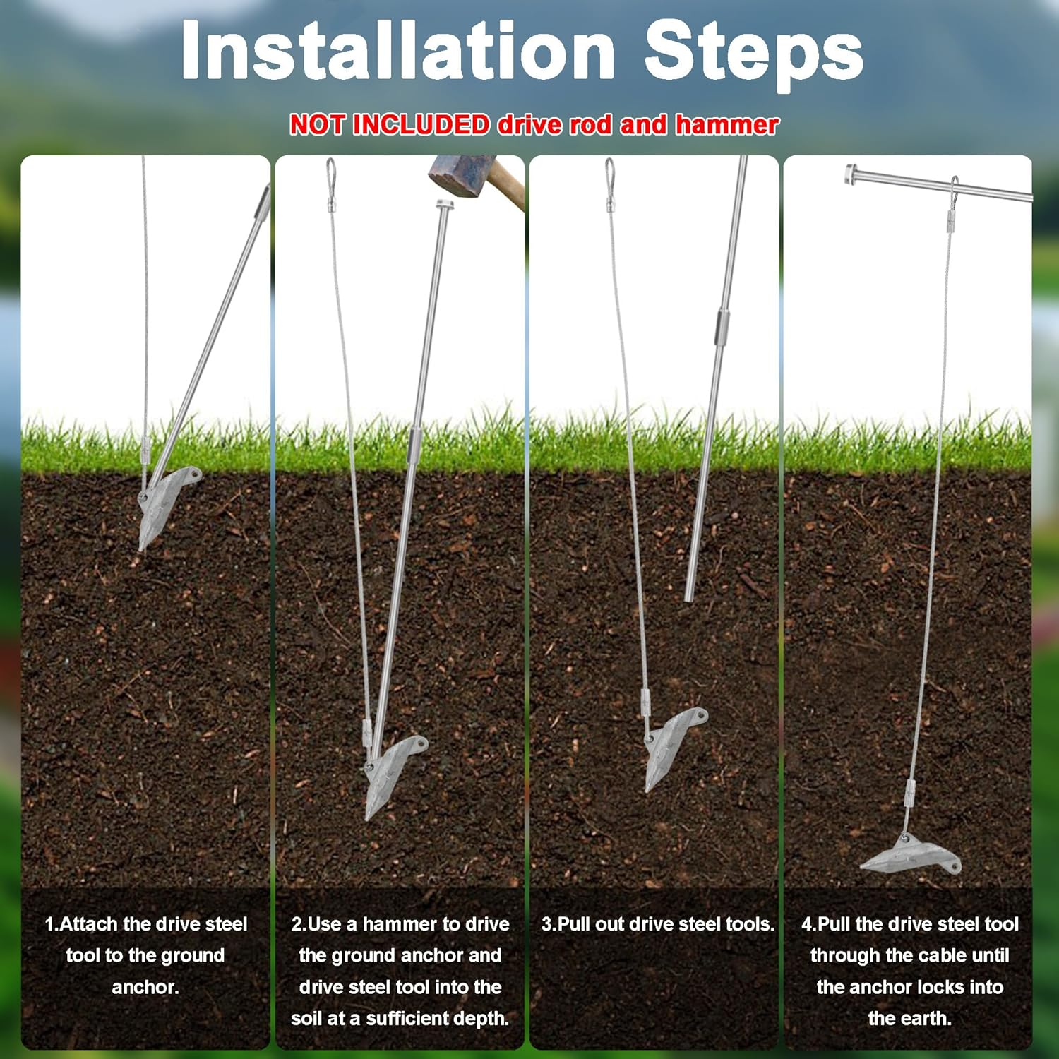 - 【Well-made and Durable】 Due to the relatively large 0.5inch diameter of the holes for the earth anchors, which fits most drive bar sizes on the market, so there will be no situation that the drive rod cannot be pulled out or taking the ground anchors out with it. Constructed with stainless steel cables and galvanized carbon steel anchors for durability, rust and corrosion resistance.