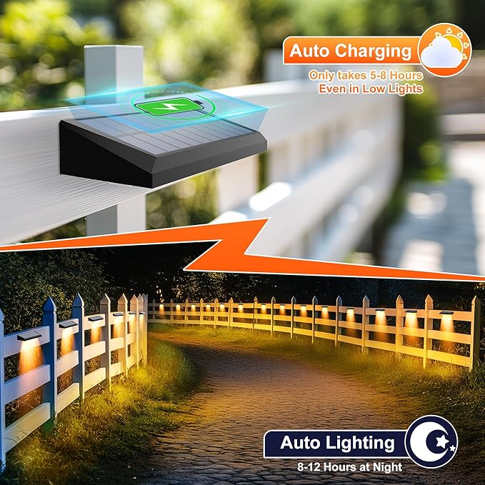 - Smart Auto On/Off Sensor: The solar fence lights auto charged 4-6 hours at daytime and auto work 8-12 hours. And auto illuminates at dusk and turns off at dawn, saving energy and ensuring hassle-free operation for homeowners. Enjoy the convenience of intelligent lighting!