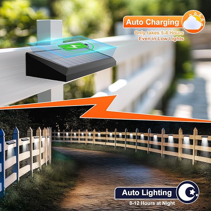 - Smart Auto On/Off Sensor: The solar fence lights auto charged 4-6 hours at daytime and auto work 8-12 hours. And auto illuminates at dusk and turns off at dawn, saving energy and ensuring hassle-free operation for homeowners. Enjoy the convenience of intelligent lighting!