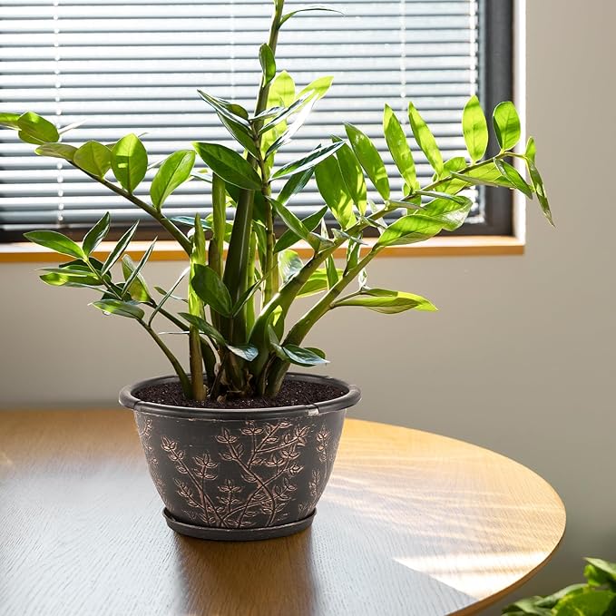 - 【Perfect Size & Retro Style】Top diameter: 12 inch, bottom diameter: 6.5 inch, height: 6.9 inch, capacity: 2 Gallon. 12 inch planters for indoor plant is perfect for planting medium to large sized plants.These flower pots outdoor is designed with climbing vines which is not just drawn on, they are “carved” into the surface. Plastic plant pots have a metal copper etching that is very attractive and add a retro feeling.