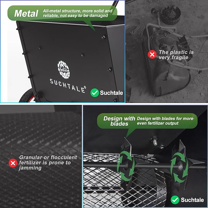 - Pre-installed & all-metal: our lawn drop spreader made from high quality iron materials and pre-installed. Enhanced with a specialized surface treatment, it boasts a protective coating that guards against rust. This not only preserves its pristine appearance but also significantly prolongs its service life. All components are detachable parts, making maintenance convenient. Such meticulous design choices underscore our commitment to offering long-lasting, high-quality products to our customers.
