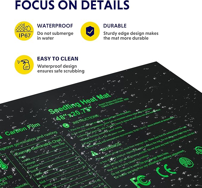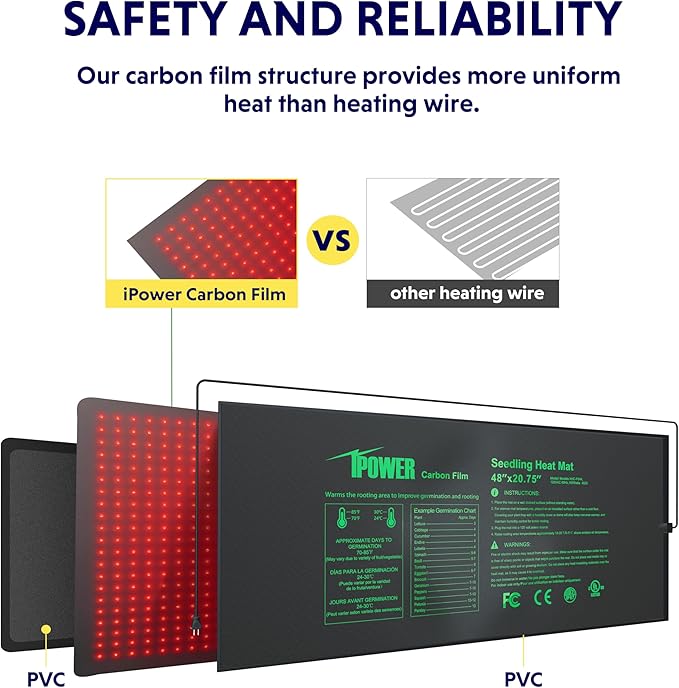 - Heating film structure: Upgraded heating film ensure uniform heating. Warms root area 10-20℉(5-11℃) over the ambient air temperature, which will increase the success of seedlings and cuttings