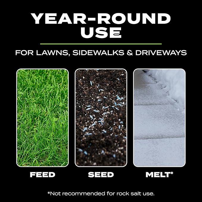 - Usage: Great for year-round use to weed, seed, fertilize and salt