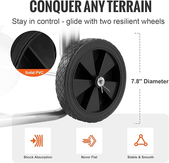 - Stable Mobility: A low center of gravity is beneficial in preventing tipping. The garden hose reel cart is equipped with two solid PVC wheels that are durable and suitable for various terrains. These wheels ensure effortless and smooth movement of the cart, even on rough or uneven ground