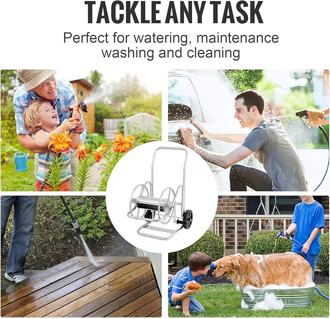 - Large Hose Capacity: Are you tired of coming up short? The hose reel cart can hold up to 200 ft of 5/8 in hose (hose not included), allowing you to reach various corners of your garden, backyard, or other areas without any limitations