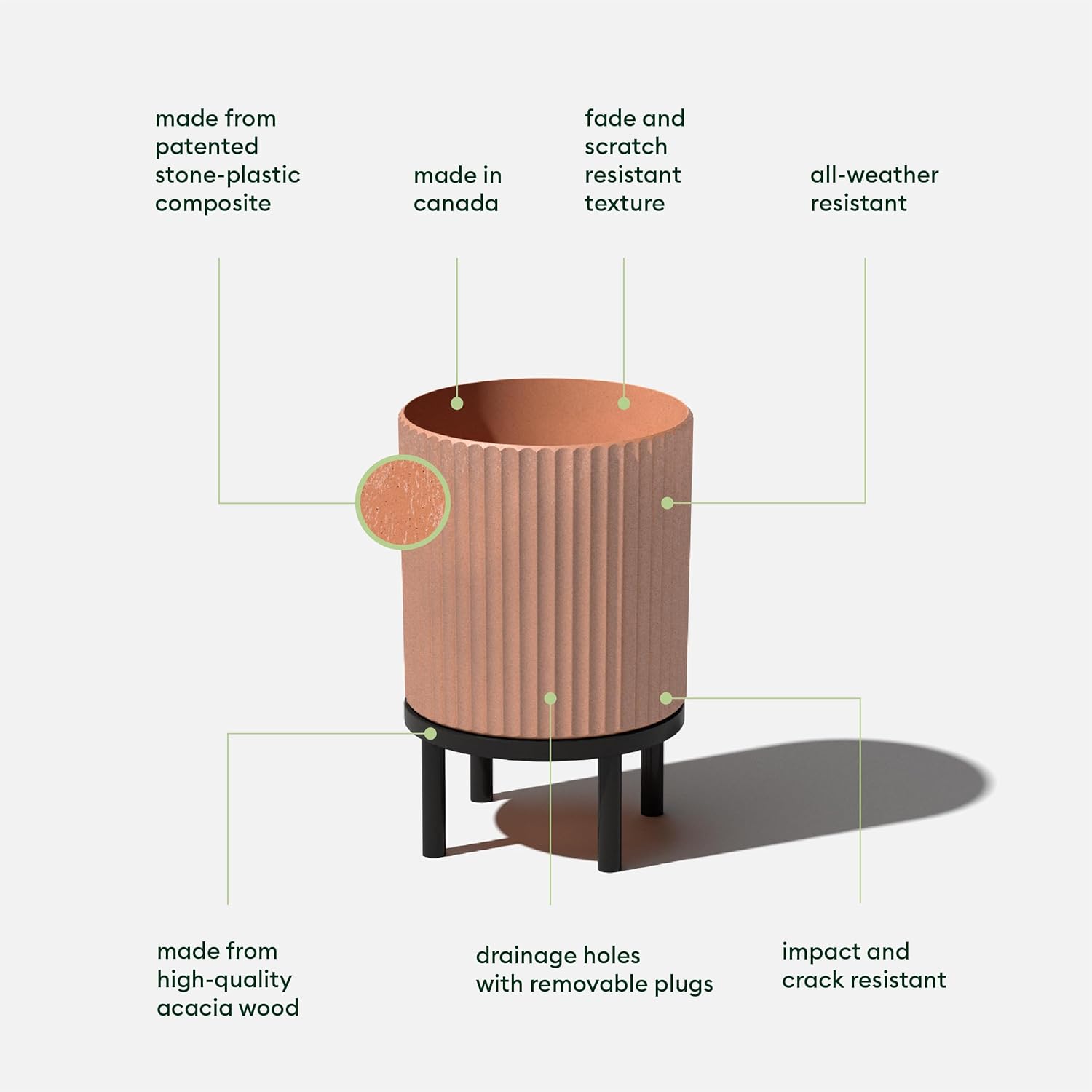 - Material : Plastic-stone composite planter & Acaia wood stand