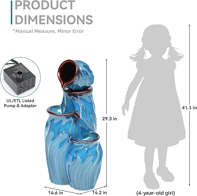 - EASY & SAFE USE: Equipped with an upgraded ETL/UL-Listed pump, 6ft standard power cord, easy to blend with any outdoor setting, just add water, plug-in and enjoy with 1-year manufacturer’s warranty. Warm Tips: During freezing temperatures, please drain the fountain, disconnect the pump, and store indoors.