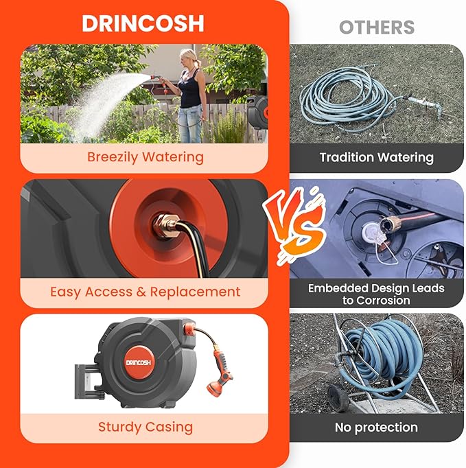 - 【Upgraded Auto-Retract & Adjustable Length Lock 】DRINCOSH garden hose reel is designed with advanced slow rewind technology, ensuring a smooth and tangle-free retraction every time. Simply give the hose a gentle pull, and it will retract safely at a controlled speed. The enhanced locking mechanism allows you to secure the hose at any desired length
