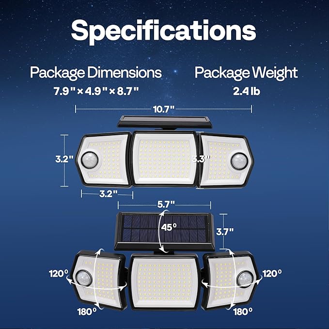 - WIDE-ANGLE MOTION COVERAGE: Dual side panels each includes a sensor with a 120° detection angle and up to 32 ft range; Panels can rotate to customize detection direction for different scenes, expanding coverage to 210° for full-area protection; Position one toward your driveway and the other at your door for “one-light-two-use”; Whether driving home at night or walking into your yard, the light responds when you need it most NOTE: Fully twisting dual side panels outward shortens detection range and may leave blind spots
