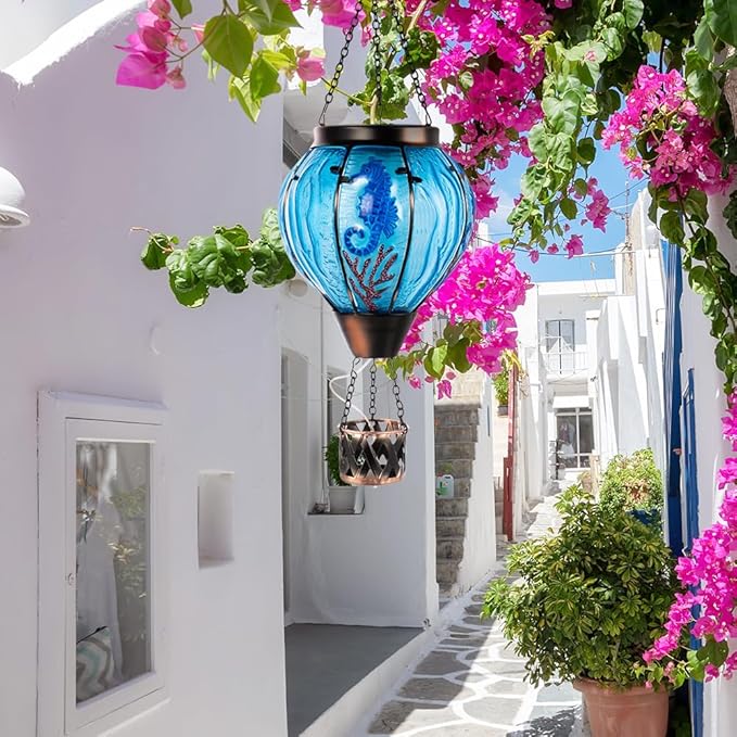 - Seahorse Solar Hot Air Balloon Lantern: Seahorse solar outdoor Lantern is made of thick glass,metal and a realistic flame lights.The hot air balloon solar light has a blue body and cute seahorse and coral patterns on the glass,as if seahorses are dancing happily in the sea.Hang exquisite seahorse lanterns to add a warm atmosphere to your garden