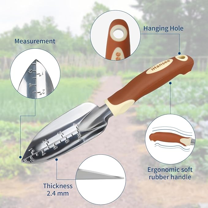 - Durable and Rust-Resistant Garden Tools: Crafted from aluminum alloy, iHansee gardening tools are lightweight yet strong, offering long-lasting durability and rust resistance. Each tool has an ergonomic concave-convex handle made of PP+TPR for a comfortable grip. Designed to reduce strain on wrists and hands, the handles provide excellent leverage for digging, planting, and weeding.