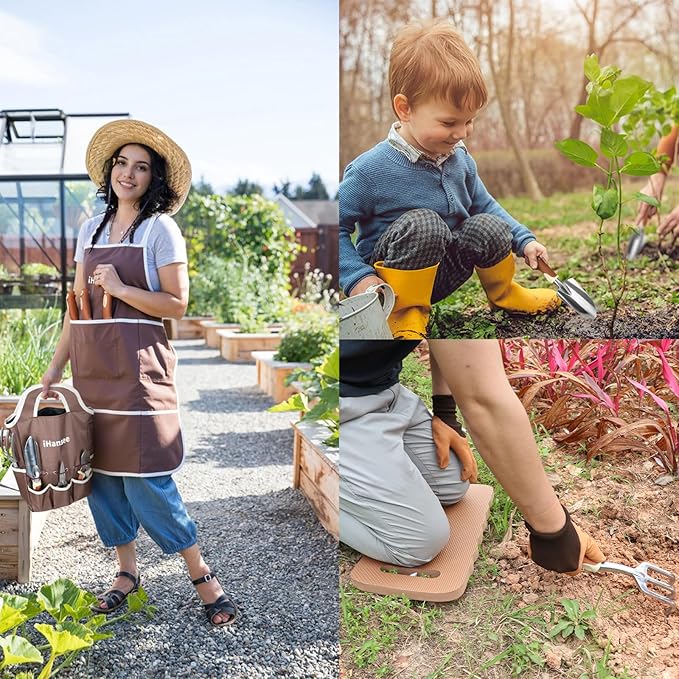- Protective Apron, Gloves and Kneeling Pad: iHansee Gardening Tool Kit includes a durable Oxford cloth apron and protective gloves to keep your clothes clean and your hands safe during gardening. The garden apron has 6 large pockets to store tools and accessories, while the gloves provide a secure grip and shield your hands from dirt, scratches, and sharp objects. Garden kneeling pad 16.5x8.6 inch provides cushioned support for your knees while planting.