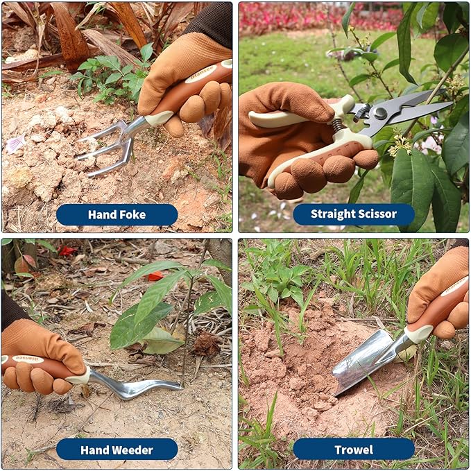 - 12-Piece Brown Garden Tool Set: Includes 8 gardening hand tools (scissor, pruner, crack weeder, trowel, hand fork, hand rake, trans planter, hand weeder), with gloves, a kneeling pad, garden apron, and a multi-pocket storage handbag to keep everything organized.