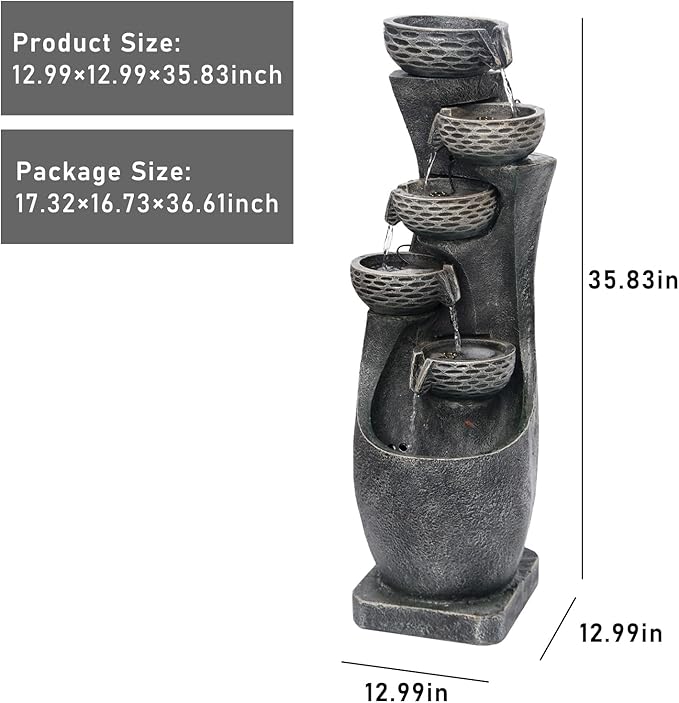 - UNIQUE DESIGN:Outdoor water fountain is in elegant grey colour, the simple geometric design combined with 5 jars makes garden fountains outdoor even more chic. The water flows slowly down, mimicking the sound of a real waterfall, making your surroundings more soothing and peaceful.