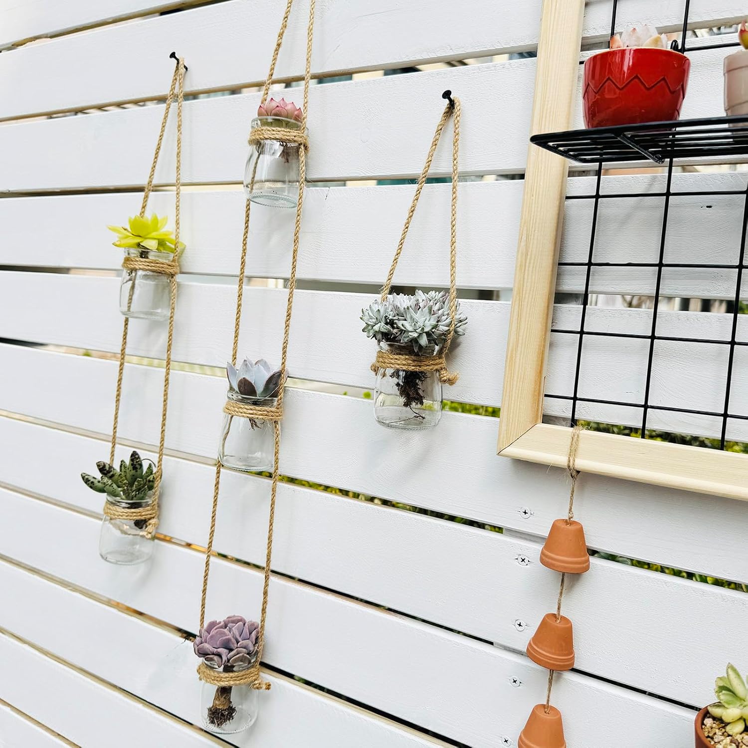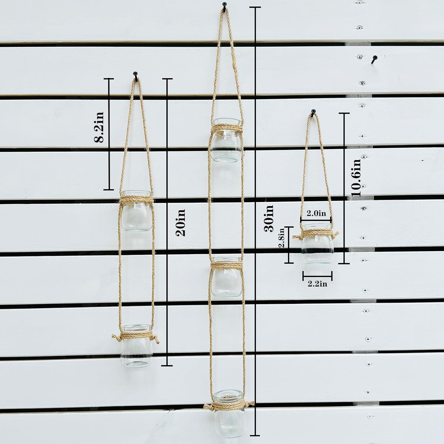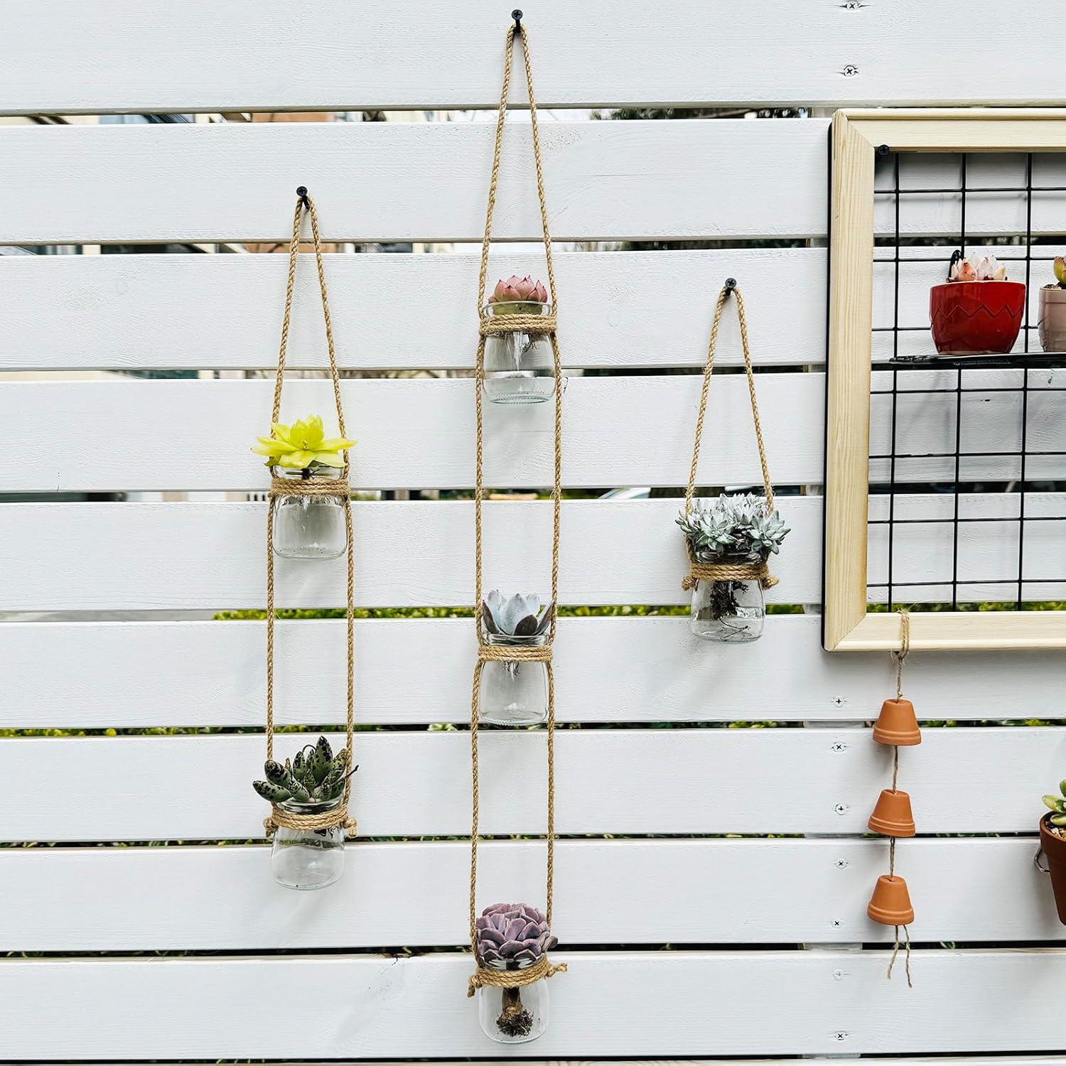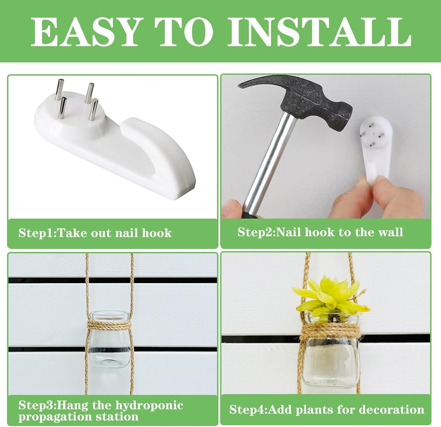 - Product Packaging:There are three strings of 6 glass bottles and three traceless nail hooks,but no plants Include.6 glass containers are made of high borosilicate heat-resistant glass. (Thick and durable, it can stand the test of time).