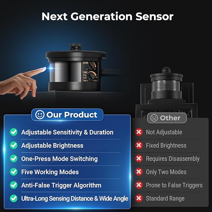 - [3 Adjustment Parameters] Adjust as you wish to find the lighting that suits you best. ① Brightness Adjustment: Adjust the brightness in Dim Mode to within a range of 15%-50%, or in ECO / D2D / ON modes to a range of 15% -100%. ② Sensitivity Adjustment: Set the sensor's detection range between 10 and 40 feet according to your requirements. ③ Lighting Holding Time Adjustment: Adjust the light holding time from 20 seconds to 5 minutes in the DIM, ECO, and D2D mode.