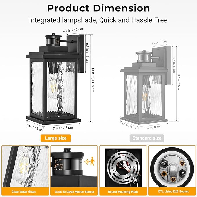 VIANIS Large Advanced Motion Sensor Outdoor Lights, Black Easy-to-Install Dusk to Dawn Outdoor Wall Lights, Aluminum Waterproof Porch Light with Water Glass for Porch, Garden, Front Door