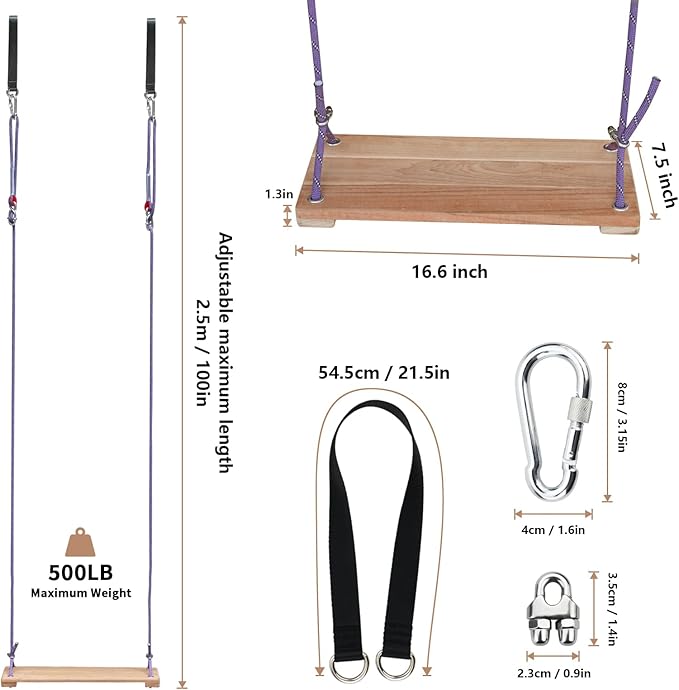 - Adjustable Height–With a rope length of 100 inches, equipped with a figure-8 buckle, rope clamps, and hooks, the swing height can be freely adjusted based on different usage scenarios. It suits people of various heights, allowing your family to fully enjoy the fun of swinging.