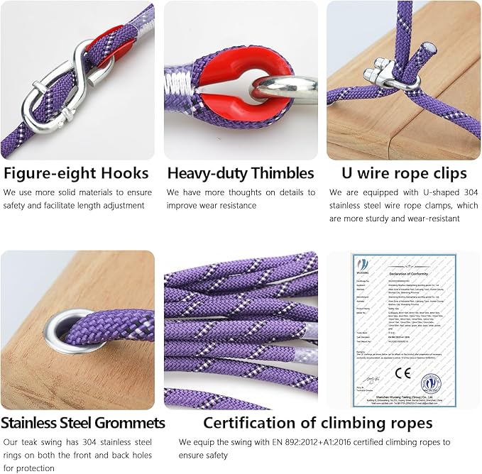 - Safer Components–The swing ropes meet the certification standards for professional climbing ropes. The connections feature thimbles and stainless steel grommets to prevent rope wear, and heavy-duty carabiners and Figure 8 Buckles are used, capable of supporting up to 500 lbs. Each teak plank is finely sanded to ensure not only joy but also safety.