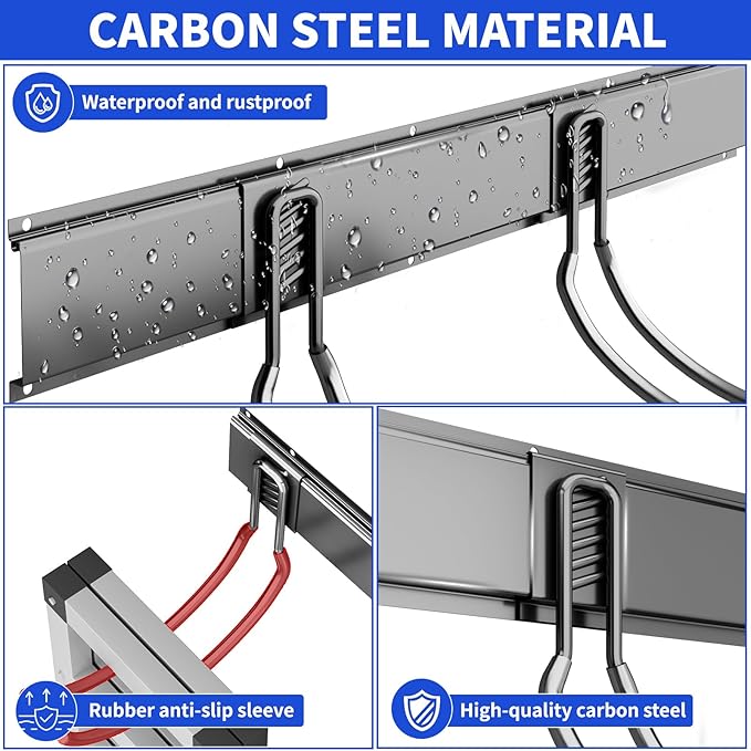 - HEAVY-DUTY 300 LBS CAPACITY: garage organizers and storage Constructed from premium steel with a rust-resistant, double powder-coated finish. Rubber-coated hooks prevent slipping. Built for long-lasting durability in your garage or garden
