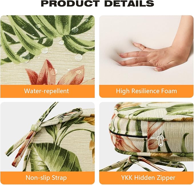 Round Corner Seat Cushions, 17" x 16" x 2", Set of 4, Indoor Outdoor Water Repellent Universal Chair Pads with Ties for Patio Furniture, Garden Deck Dining Chairs, Leaf and Flower