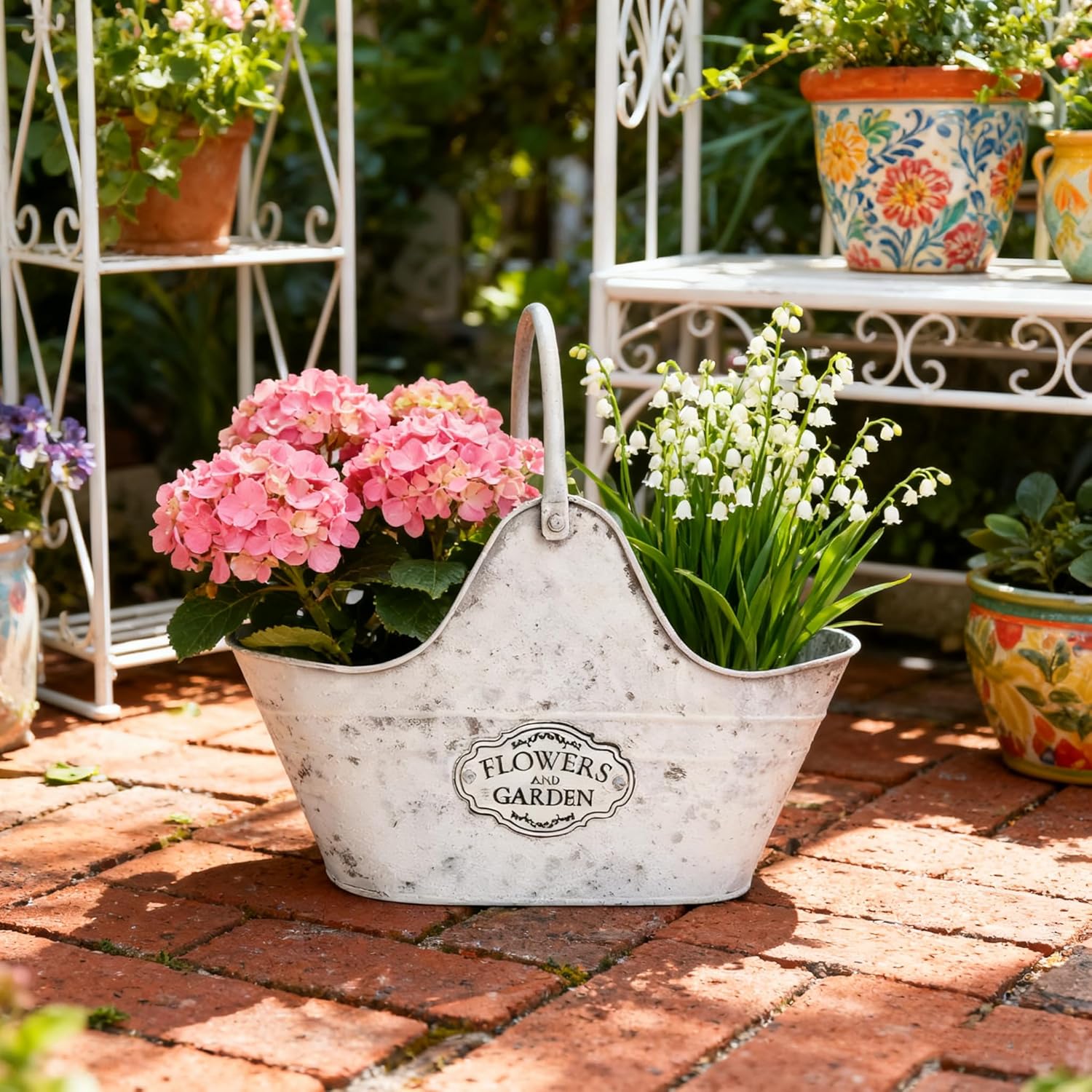- 【VINTAGE “FLOWERS AND GARDEN” DESIGN】Features a distressed white galvanized metal finish with “Flowers and Garden” emblem, adding rustic farmhouse charm to any space – perfect for vintage, boho, or classic decor styles.
