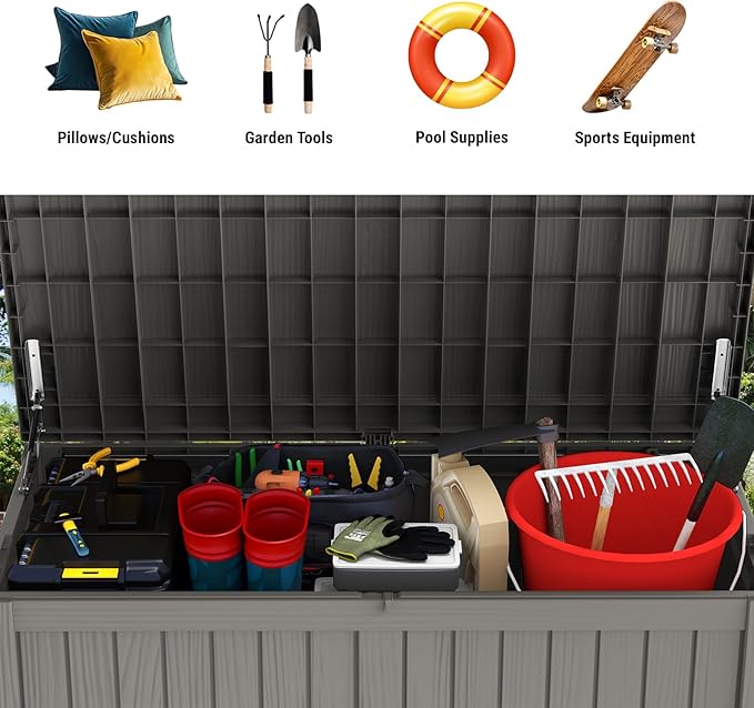 - 【Reinforced Durability & Organization】- Built with reinforced metal rods for extra internal supports, this deck box offers 30% enhanced strength to resist deformation, ensuring long-term stability, the removable interior divider keeps your items neatly arranged and easy to find, making it the ideal storage solution for all your outdoor needs