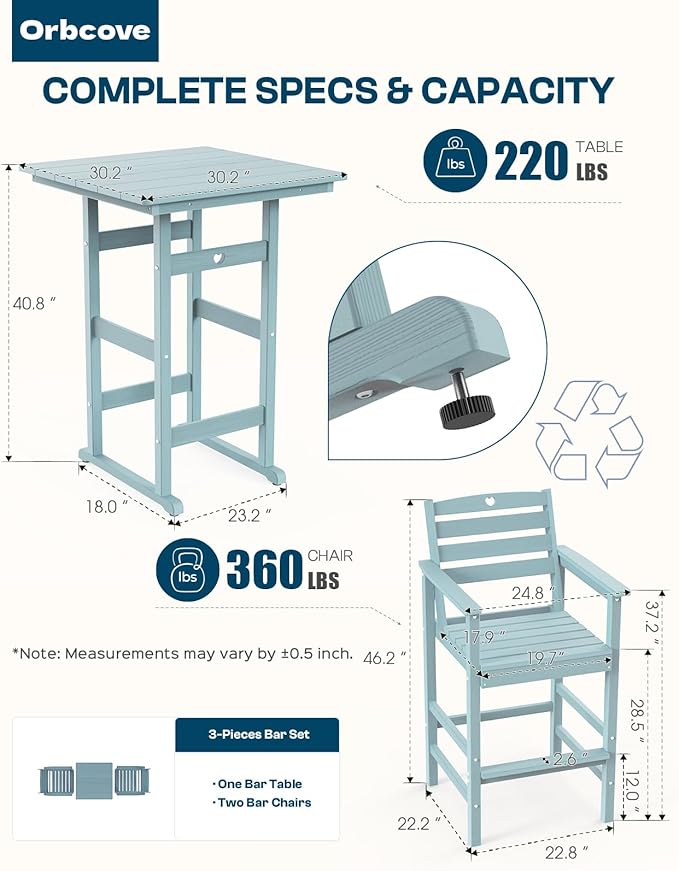 - Durable All-Weather Design: (Please note!!!Your order consists of two or three separate packages, which may be delivered at different times.) Crafted from HDPE with a natural wood grain finish, Orbcove bar table and chairs set withstands sun, rain, and wind without fading or cracking. Ideal for deck furniture, backyard furniture, or porch furniture, it’s perfect for year-round outdoor living.