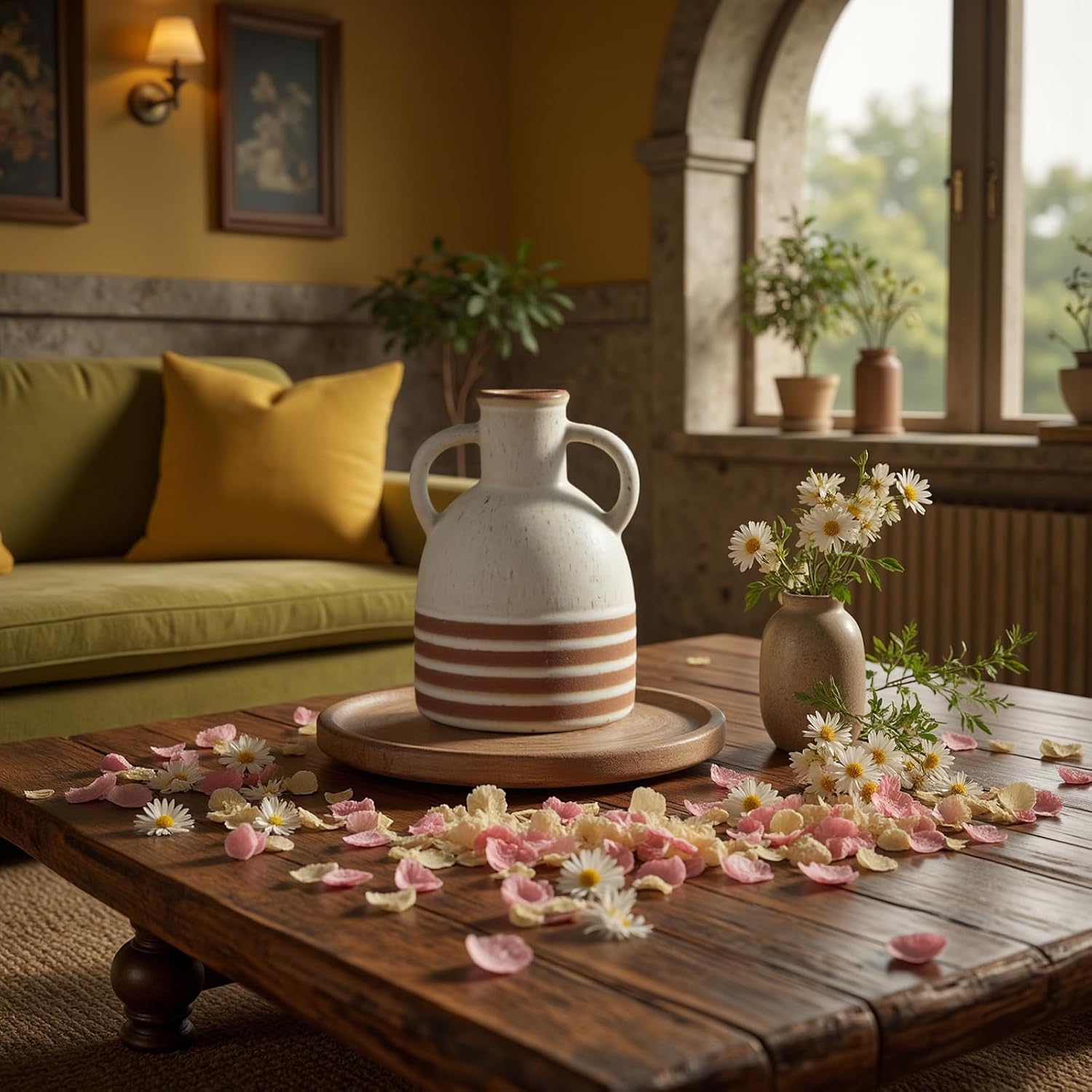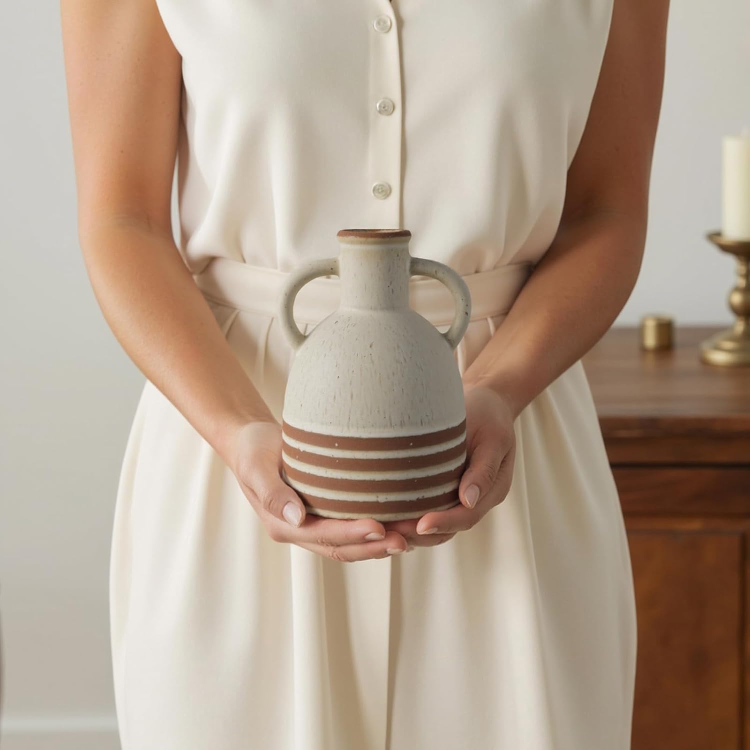 - 【CRAFTED FROM PREMIUM QUALITY CERAMIC】 You will be amazed by the craftsmanship of this farmhouse rustic vases for home decor, which are handcrafted by skilled artisans and fired at temperatures up to 1300 degrees to ensure long-lasting durability. This chic vase will complement your home decor, and its scratch-resistant base will ensure your furniture will remain beautiful for years to come.