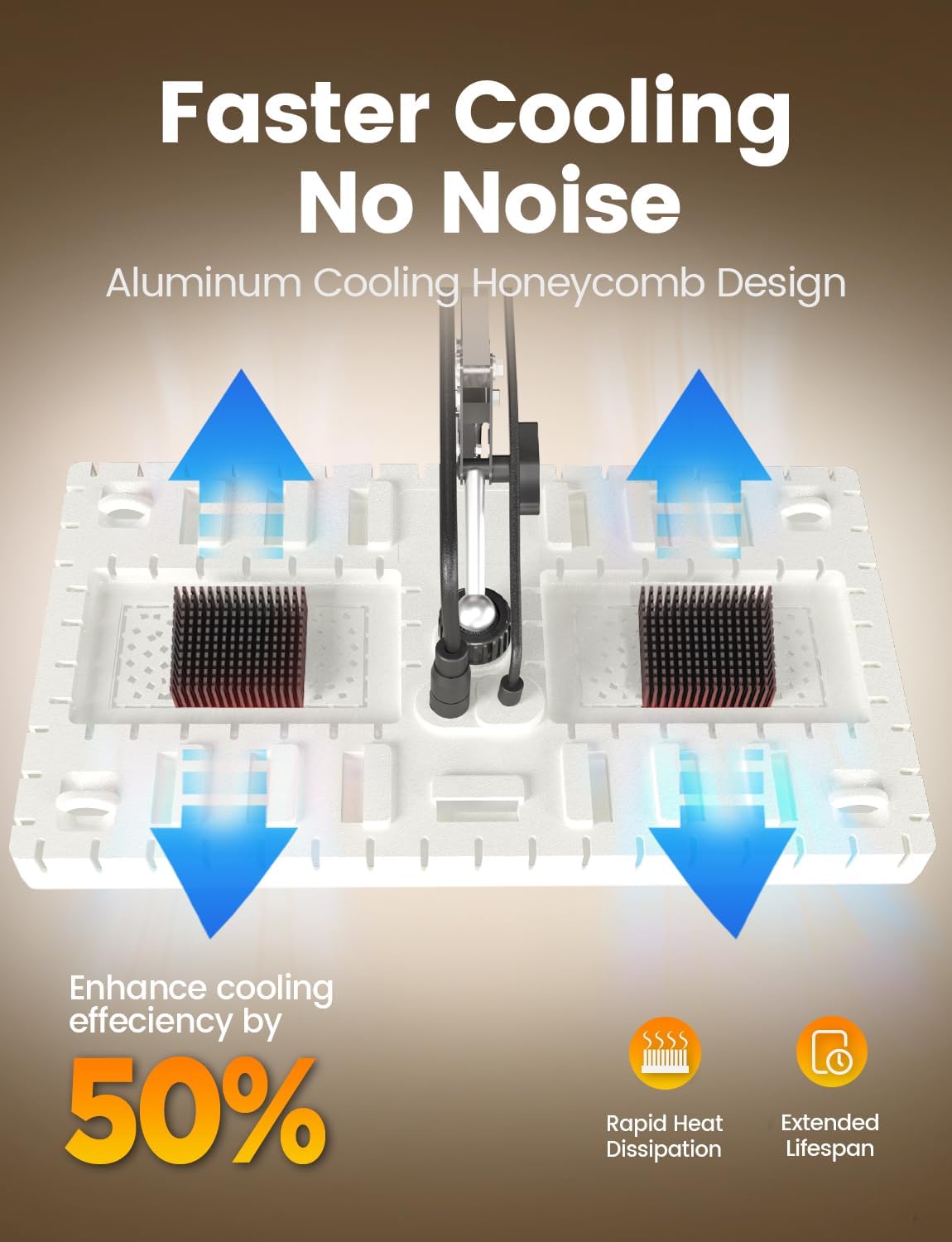 - 【Advanced Heat Dissipation】: Our light features cutting-edge aluminum honeycomb heat dissipation technology, enhancing cooling efficiency by 50% over others. Enjoy silent, worry-free operation with no overheating issues. We prioritize your safety with rare power protection devices and multiple professional certifications, including CE and FCC, ensuring the utmost well-being of your indoor garden. This LED grow light is designed for reliability and safety.
