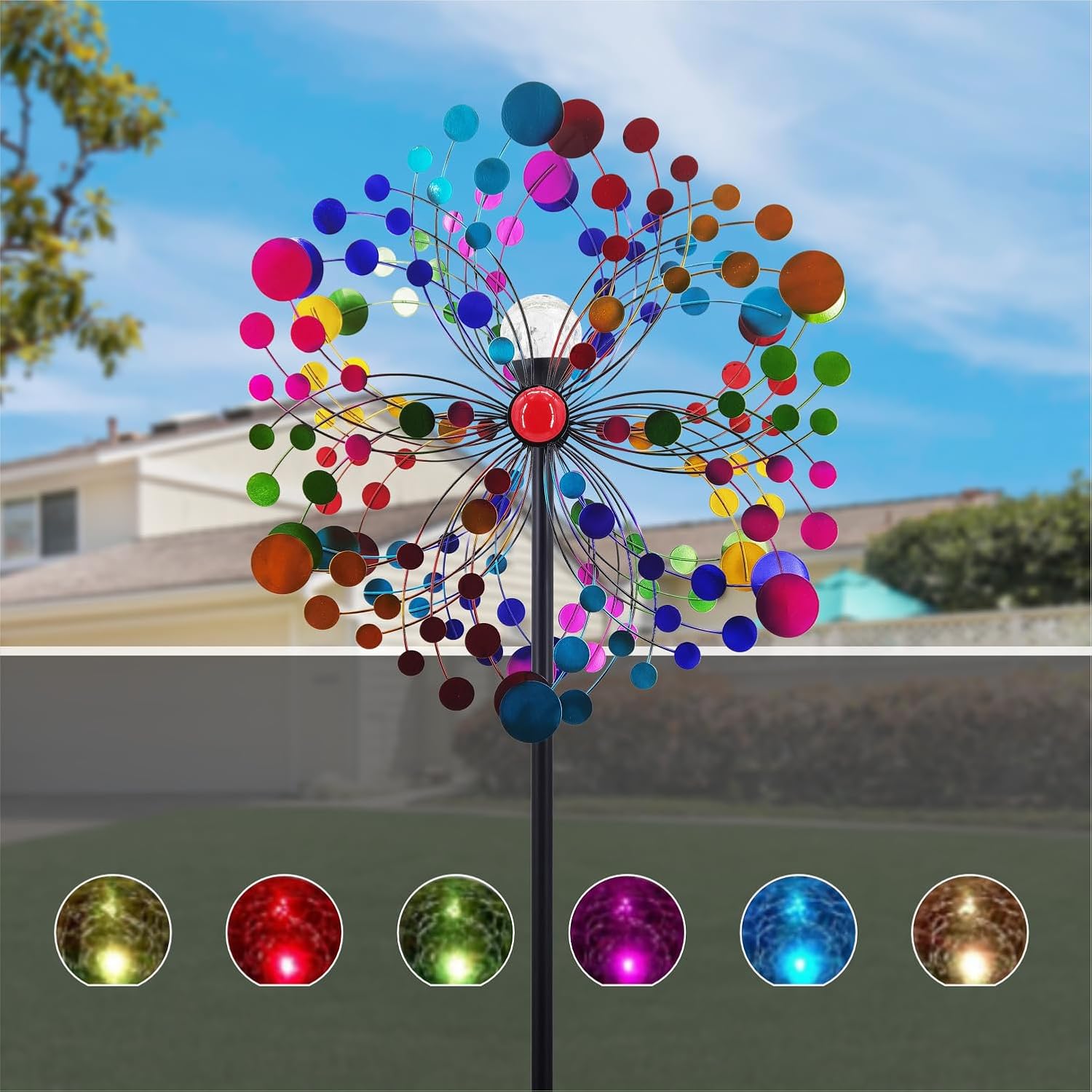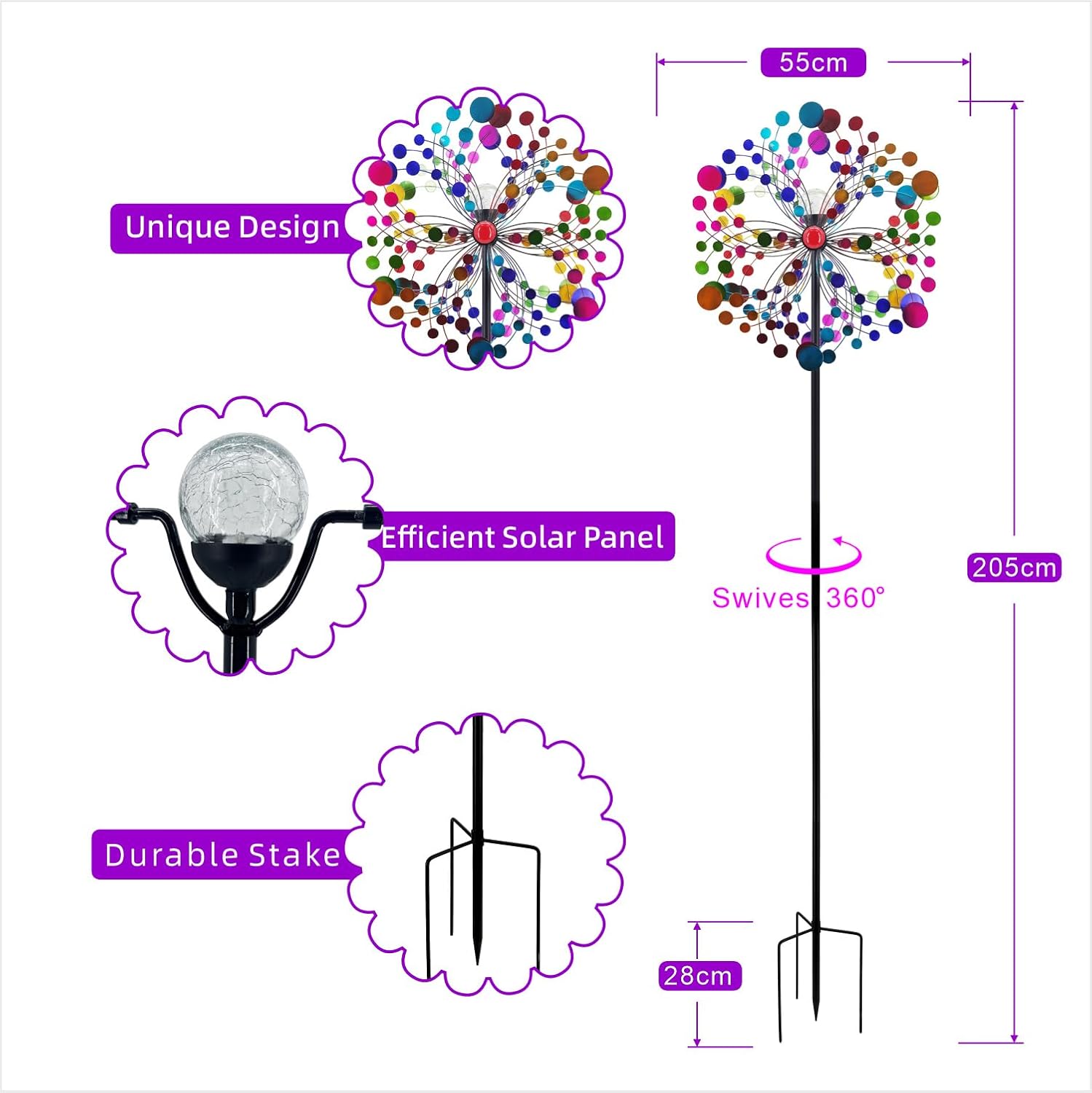 - Special Feature : After sales service:excellent customer service is we pursuing.Any problem about product or assemble please contact us via amazon email.Our professional team will solve your problem within 24hs., Auto on and off:users turn the switch of crackle ball to "ON" position and place it upon wind spinner.The solar lights will automatically light up and change color during 6 colors in night after dusk., High craftsmanship:the garden spinner is made of durable metal and fine welding technology.Ball bearing construction allows the wind spinner smoothly spin even in the slightest breeze., Perfect garden decoration:the garden spinner with unique design can decor and add vitality to garden very well .User can assemble different number of rods to adjust the height of wind spinner according to needs.Size: Dia 22.64",Height 88.58", Stable and anti-rust:kinetic wind spinner has thick metal pole and a triangular structure sturdy pile will improve anti-wind ability.The surface of anti-rust coated can withstand different kinds of weather and prolong the service life. After sales service:excellent customer service is we pursuing.Any problem about product or assemble please contact us via amazon email.Our professional team will s… See more