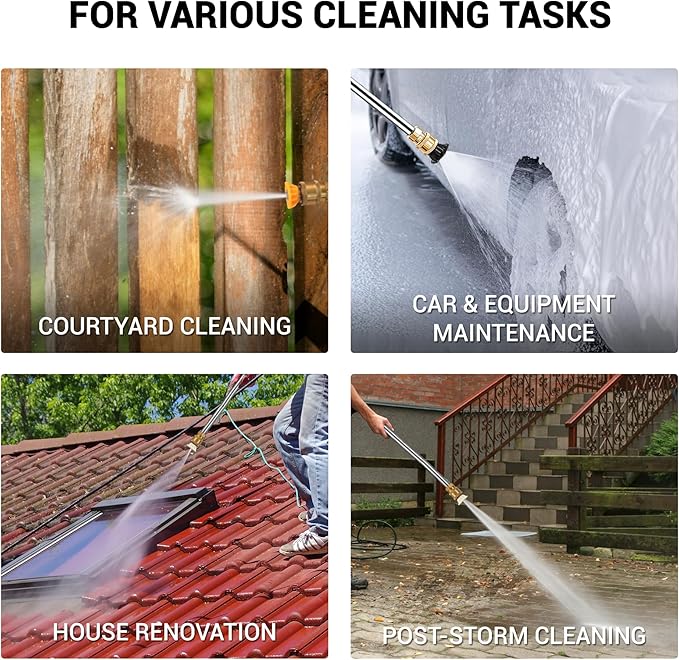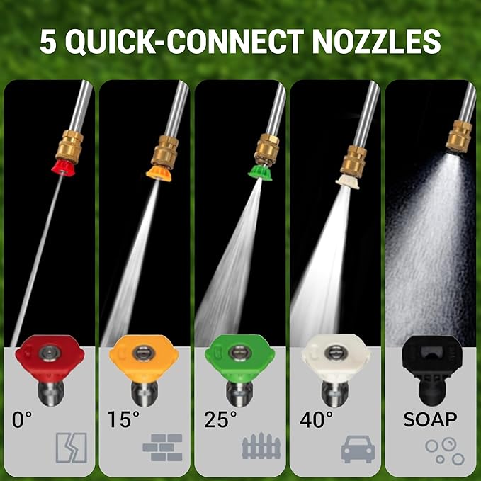- [๐ ๐๐ ๐๐จ๐ณ๐ณ๐ฅ๐๐ฌ ๐๐จ๐ซ ๐๐ฅ๐ฅ ๐๐ฅ๐๐๐ง๐ฎ๐ฉ ๐๐๐๐๐ฌ โ ๐๐ซ๐จ๐ฆ ๐๐๐ข๐ฅ๐ฒ ๐๐จ๐ฎ๐ฌ๐ ๐๐ฅ๐๐๐ง๐ฎ๐ฉ ๐ญ๐จ ๐๐๐ซ๐ ๐ ๐๐ช๐ฎ๐ข๐ฉ๐ฆ๐๐ง๐ญ ๐๐๐ข๐ง๐ญ๐๐ง๐๐ง๐๐] Easily switch between 5 quick-connect nozzles (0ยฐ, 15ยฐ, 25ยฐ, 40ยฐ, and soap). From high-pressure jets (0ยฐ) for deep stains to gentle 40ยฐ spray for delicate surfacesโthe washer easily covers every cleaning need for gutters, driveways, home exteriors, decks, fences, furniture, cars/RV, boats, or mechanical equipment maintenance.