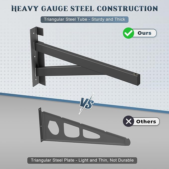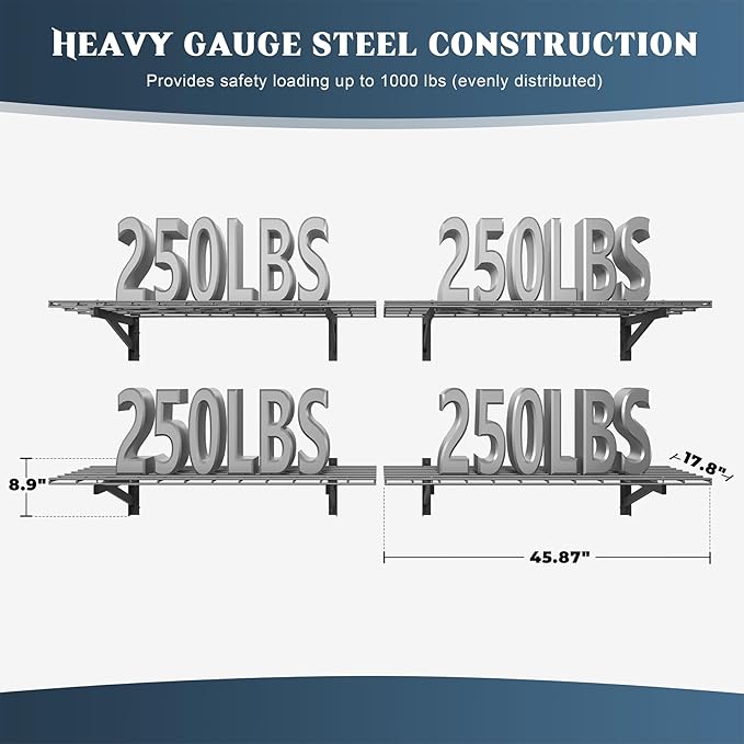 - đăHeavy-Duty Load Capacityă- Jusgym garage shelving wall mounted system is engineered with premium steel, offering exceptional strength. Each 1.5x4ft bracket holds up to 250 lbs, and with 4 shelves totaling 1000lbs capacity, it effortlessly stores bulky items like tools, tires, and heavy storage bins. Built to last, even under extreme weight!