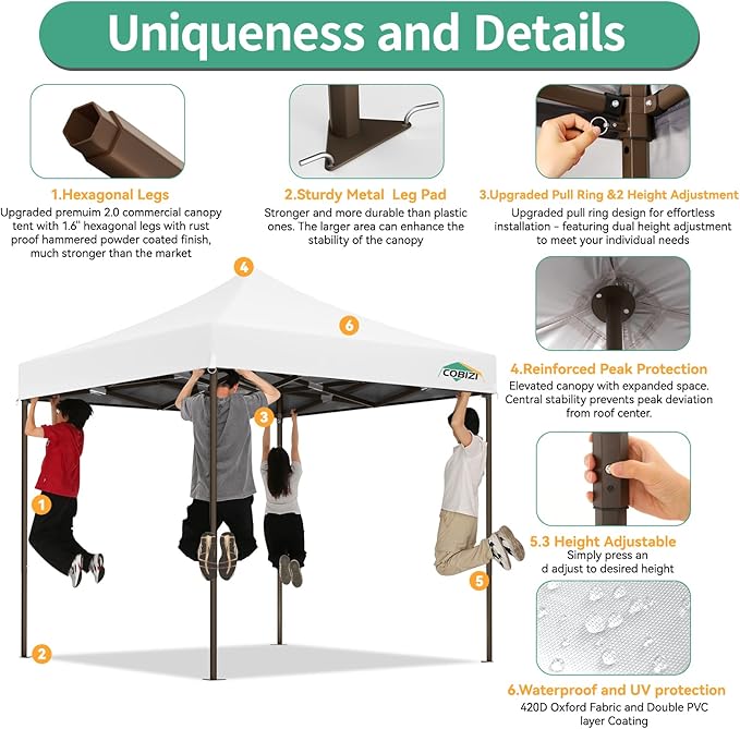 - [Upgrade Heavy Duty Canopy] The COBIZI 10x10 Heavy Duty Canopy features a commercial-grade full truss structure constructed from durable powder-coated stainless steel. The thickness of the 1.77 inch (45mm) hexagonal legs has been increased to 0.7mm/0.03 inches, providing superior stability and durability. Full truss design ensures exceptional sturdiness and rust resistance, capable of withstanding wind speeds of up to 30mph when properly secured with an number of ropes, and stakes.