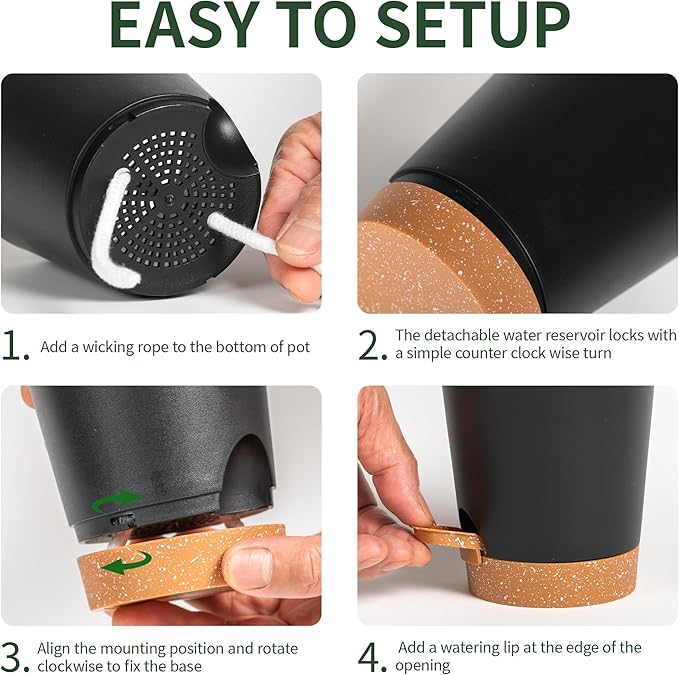 - Self-Watering Planter System: Our 4 inch small self watering plant pots feature a built-in wick rope that draws water from the reservoir, ensuring consistent hydration for your indoor and outdoor plants. Perfect for busy plant owners and those who forget to water!
