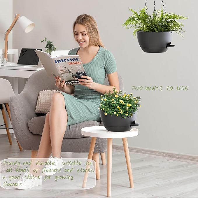 - 【Self-Watering Hanging Flower Pots with Removable Saucer】the appearance and structural design of the Hanging Pot prevents overwatering and acts as a water reservoir to promote Plant growth. It is suitable for a variety of Hanging Pot Plants, such as ivy, Herbs, Ferns, Philodendrons, Succulents, Flowers or other Plants