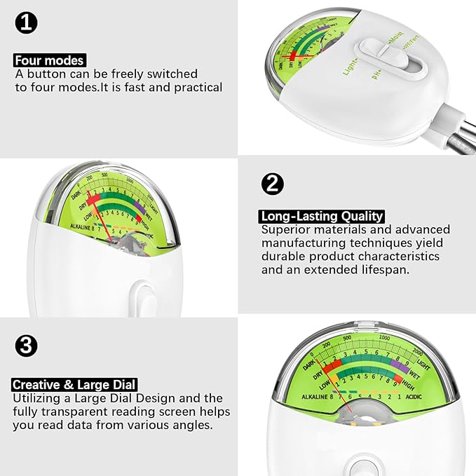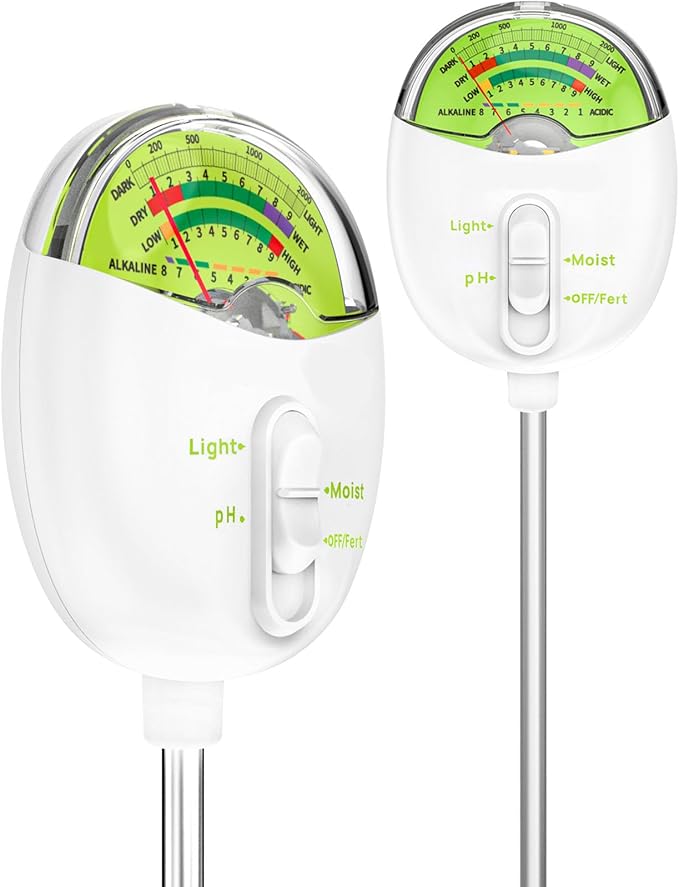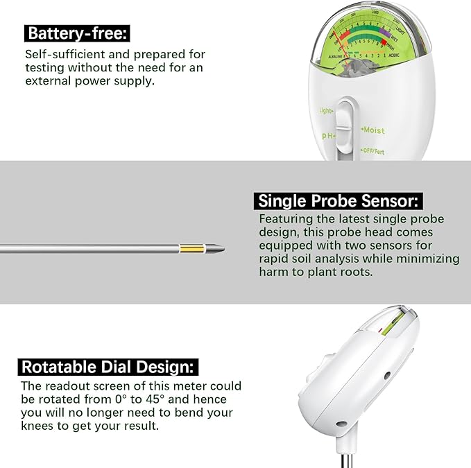 - Precise and Durable Sensor Design: Built with a corrosion-resistant, upgraded stainless steel probe, this soil test meter ensures reliable performance and accurate readings. Quickly detect essential factors like acidity, moisture and fertility to guide your plant care routine effectively