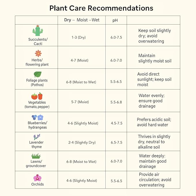- Usage Tips & Friendly Support: Avoid testing dry or hard soil directly and lightly moisten soil before use to protect the sensor. Not suitable for testing liquid solutions. Backed by U.S. design and technology patents, we offer responsive customer service to ensure your satisfaction